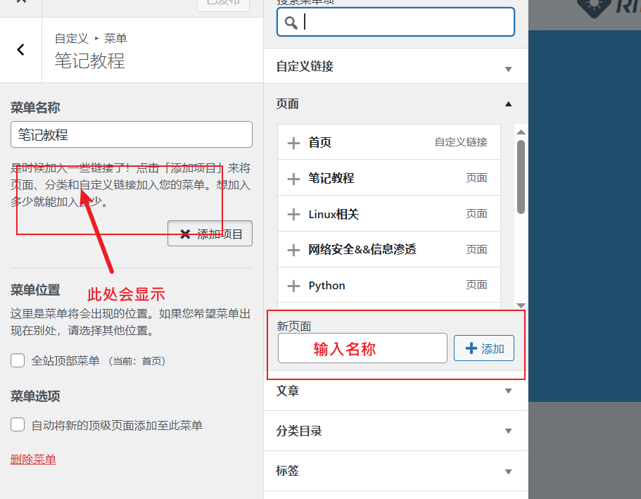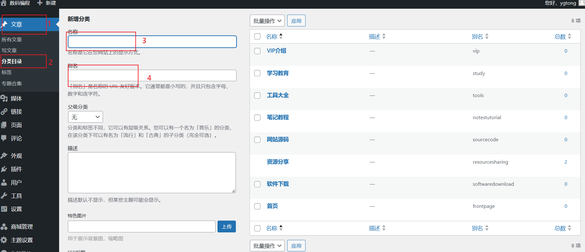 1、添加顶层分类:点击文章-分类目录