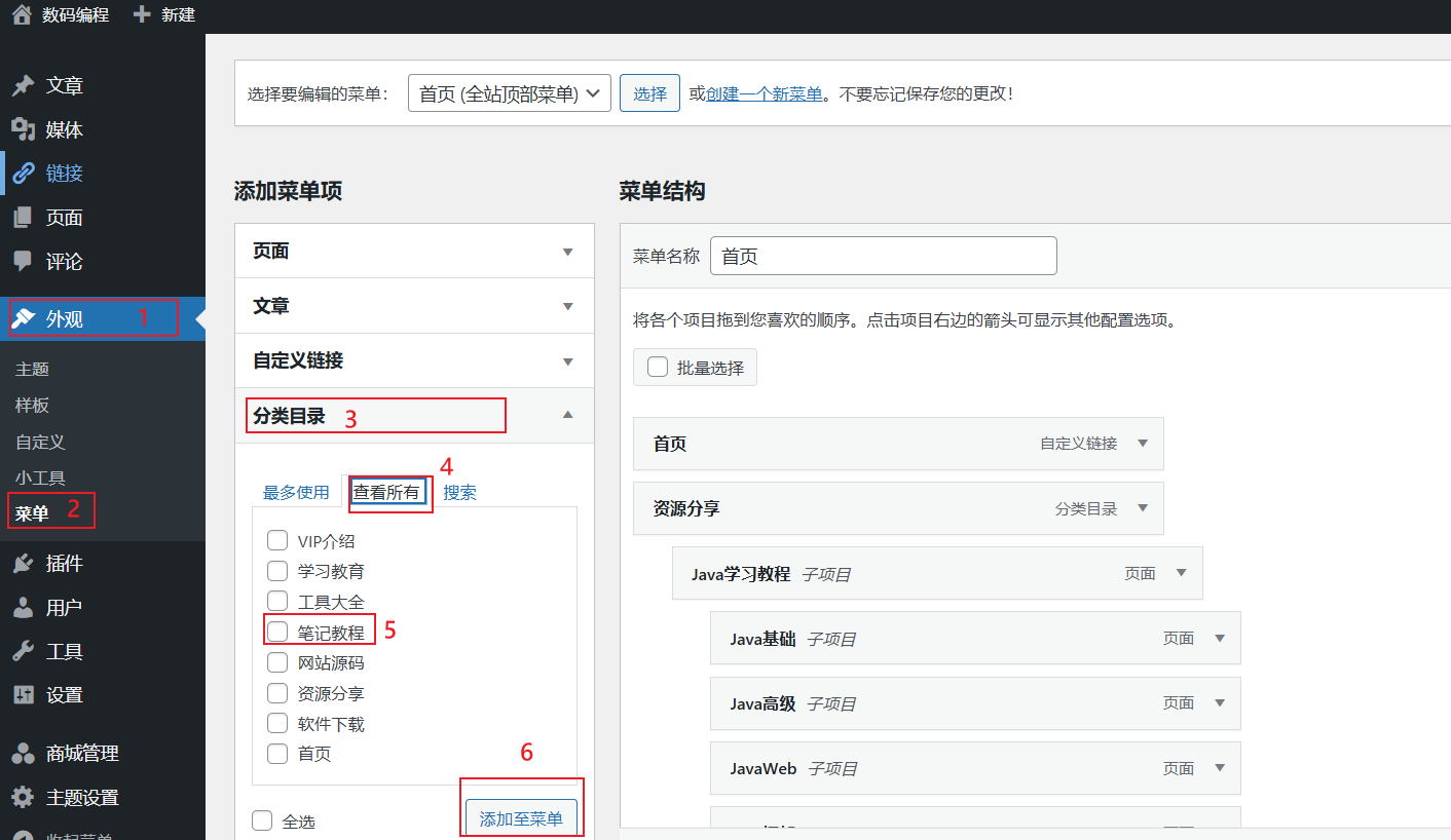 2、到外观-菜单-找到分类目录