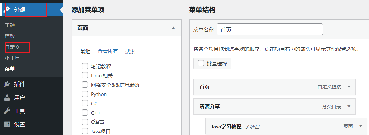 1、到外观-自定义-选择菜单,找到要添加目录的名称