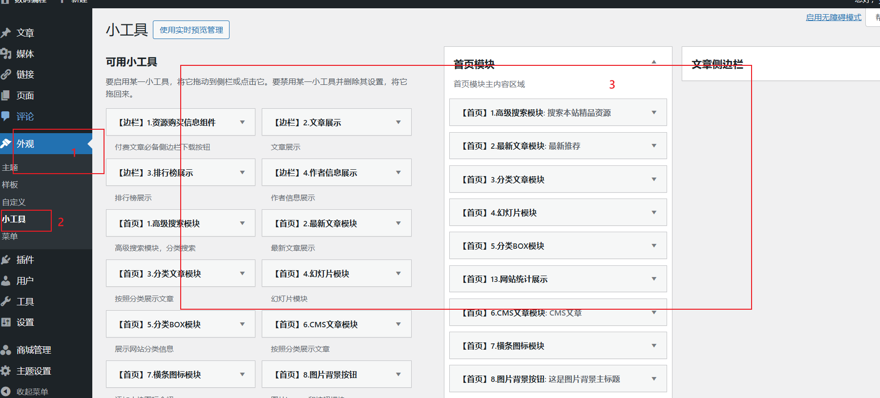1、小工具主要是配置首页目录中的 页面展示位置